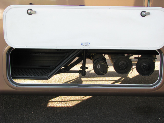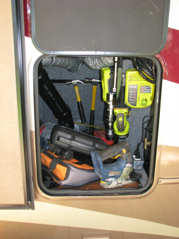 Sewer compartment.jpg (107473 bytes)Here is my preferred sewer compartment - at least the current version of it. It has an extra sewer hose storage tube, and a place for storing "black" elbows and connectors away from "clean" areas. Something like this is likely to be standard in the 2013 models.