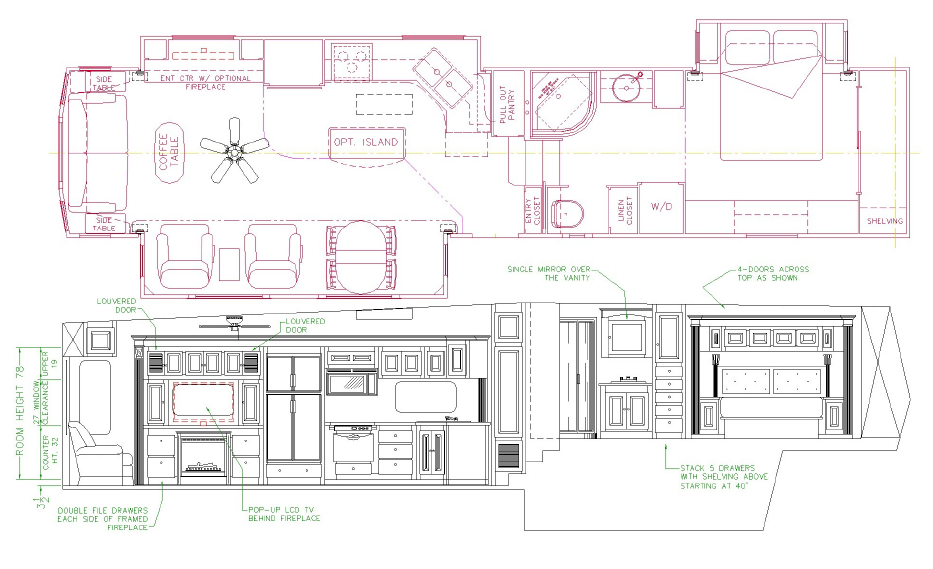 Like all modern coaches it has a wide body design. With its 6’8” bedroom one-level height it has more bed/bath headroom than any other 5th wheel. This makes it possible (for example) to delete the standard skylight in the shower if you wish, since there is enough headroom for most people. In other coaches, tall people need that skylight space in order to shower. Why would you want to do that? Well, the skylight lets in lots of heat and cold if you are not always in temperate climates.