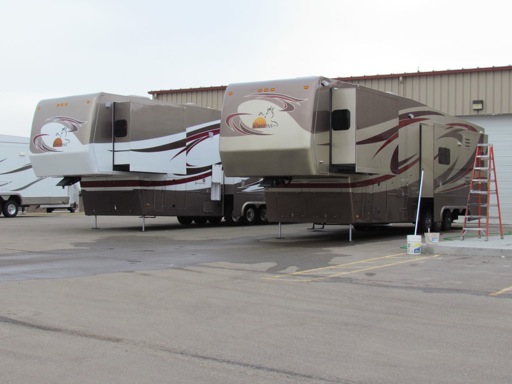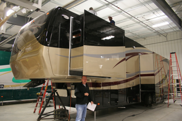 We arrived at the factory in our Royals International on a Saturday. We plugged into their power and water behind the service center (they service all brands of towable RVs, and many things on motorized RVs). We connected to their wireless Internet for our “surfing pleasure”. On Monday morning we met with Phil for a factory tour. This took a couple of hours. We got to go inside any of the rigs under construction, and Phil answered all of our questions. Nothing I asked him stumped him – unlike other factory tours we have taken. Phil is clearly proud of the new, modern factory they built and he often does the tours himself.