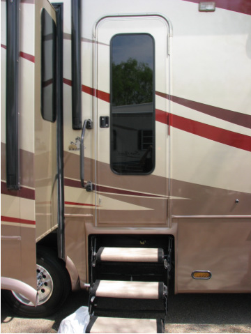 • Steps are three steps instead of four. These are upgraded aluminum steps that are powder coated, with deeper treads. We use a portable step for the bottom step. This allows us to adapt for uneven ground, and/or a deck. These aluminum steps are quite nice - but the tread depth is shallow, and that is a compromise. Consider carefully if that would work for you. I like the maintenance-free steps...but I might reconsider next time and put in the three-step version of the steps with deeper treads.