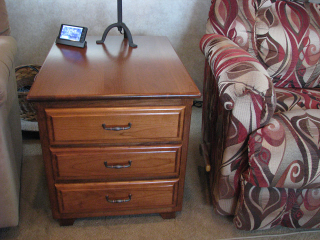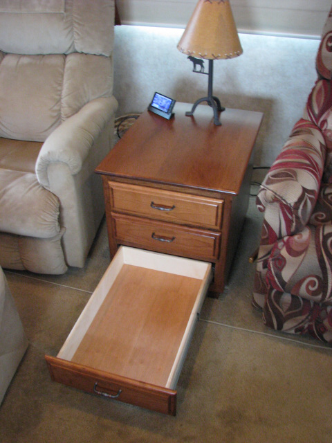 We had a custom end table made to sit between the recliners. There are three 24" deep drawers that can hold laptop computers, remote controls and office supplies. The table is cherry to match the rest of the interior woodwork. A very nice addition, but obviously pricey. This is a true piece of custom furniture.