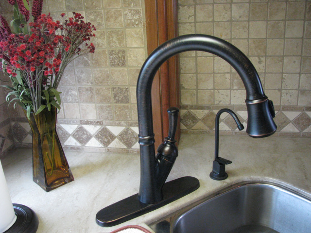 Faucet.jpg (146384 bytes)We replaced the standard faucet with an oiled bronze Delta High Rise faucet, model 19949-DST. This has a high pot faucet, removable spray assembly, and a diamond-embedded ceramic cartridge for maximum lifetime. This faucet is available from Lowes (but not Home Depot). Take a look at it here. It also has a magnetic docking rim for the removable spout. The standard faucet has been upgraded to a Moen version that looks similar to this one. We prefer the Delta because of some of its technical attributes.