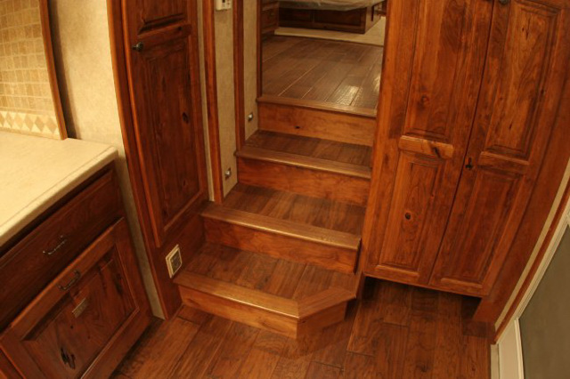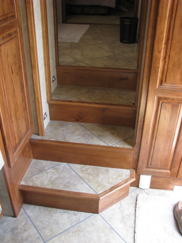 New steps standard tile.jpg (72755 bytes)  Schoening wood steps.jpg (103194 bytes)The "new" stairs (starting in 2011) have deeper tread depths. It makes navigating up and down to the bed/bath much easier. The first picture shows the standard vinyl tiles that we have in our 2010 coach. The second picture shows stairs built with custom distressed Hickory flooring. In this coach the flooring covers all the main living area and the bath area. Also, look at how the coat closet is elevated above the floor, leaving an area to put your shoes if you remove them when coming in. That was our suggestion, and we incorporated it into our 2012 coach. It keeps the shoes "mostly" our of the way.