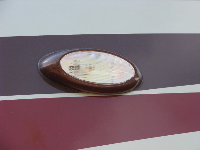 Scare light.jpg (64980 bytes)New outside "scare" lights. Note they are painted to match the body color. These oval ones look nicer than our round ones. I would specify this for the porch light - they look nicer and put out far more light - and I would place it in the center over the door opening instead of off to the side. That way it lights the step area from above better.