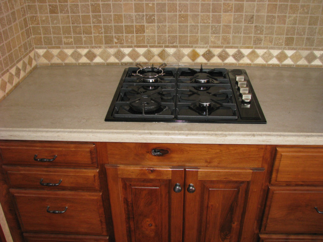 • Cook top is the (now) standard black Verona 4-burner unit on top of the counter. Done over, I would change this to the glass top gas unit, also Verona. It is easy to clean (far better than stainless) but the glass would be even better. Take a look at the 30" GE Profile gas/glass cooktop. It is a nice unit, but the larger size is a consideration unless you stretch the kitchen in that area.
