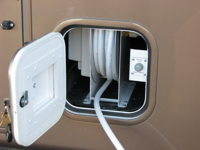 Water hose reel.jpg (94623 bytes) You can get a powered water reel that is similar to the power cord reel. It comes in 50' and 75' lengths. It uses 1/2" water hose, which is adequate but cuts down on flow slightly. Remember, your interior water lines are all 1/2". You can substitute 5/8" line but it reduces the length of the line.