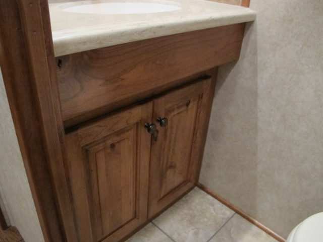 Schoening bath.jpg (52590 bytes)bathroom vanity 2.jpg (98987 bytes)On the far left is the "normal" vanity treatment for a larger bedroom unit. Our 2010 coach would have looked like this if we had not added the cabinet next to the vanity. We lost the large drawers  and upper medicine cabinet area. There is a lot of vanity top here and it is very nice.  Note the wood floor continuing in the bath area.