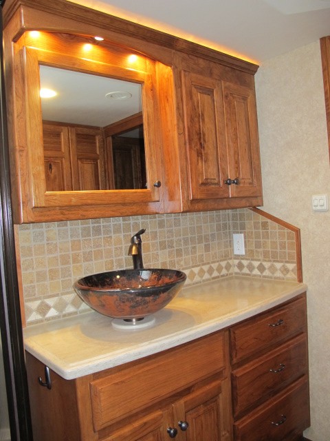 While we are on the topic of bath vanities - here is a customization of the small vanity in the toilet room. Note that the lower area is recessed in, to allow additional "knee room" on the toilet (which you can just see in t the lower right portion of the picture. In this instance, the toilet paper holder is also inside on the door of the cabinet.